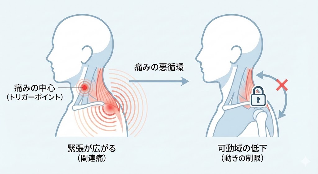 また、軽微な筋損傷が周囲の筋肉の痙縮を誘発したり、一カ所の痙縮が他の筋肉の痙縮も引き起こす…などの「痛みと緊張の連鎖」が起きやすいのも寝違えの特徴です。
