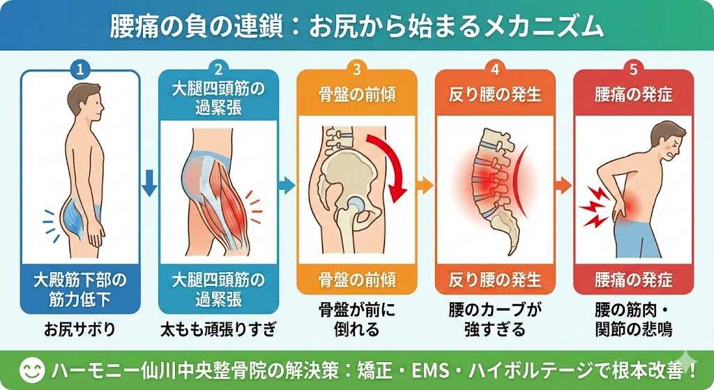 腰痛は、ただの「老化」や「使いすぎ」だけではありません。お尻の筋肉の弱さや、姿勢のゆがみが積み重なって起きた「結果」なのです。