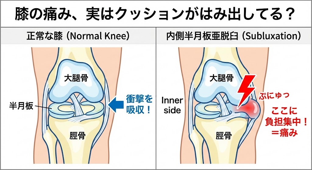 今回は、意外と知られていないけれど多くの人を悩ませている**「内側半月板亜脱臼(ないそくはんげつばんあだっきゅう)」**について、分かりやすく解説します。