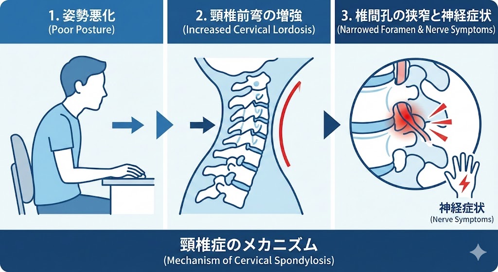 「ただの肩こりがひどくなっただけかな?」「湿布を貼って様子を見よう」 そう思って放置してしまう方が非常に多いのですが、実はその症状、首の骨からのSOSサインである「頸椎症(けいついしょう)」の初期症状かもしれません。