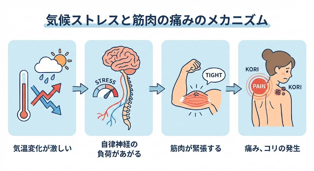 一日の気温差が7度を超えると、体は体温調節のために膨大なエネルギーを消費します。これを「寒暖差疲労」と呼びます。何度も体温を上げ下げしようと自律神経がフル稼働することで、神経が疲弊し、結果として筋肉の過緊張(コリ)や冷え、重だるさを引き起こすのです。